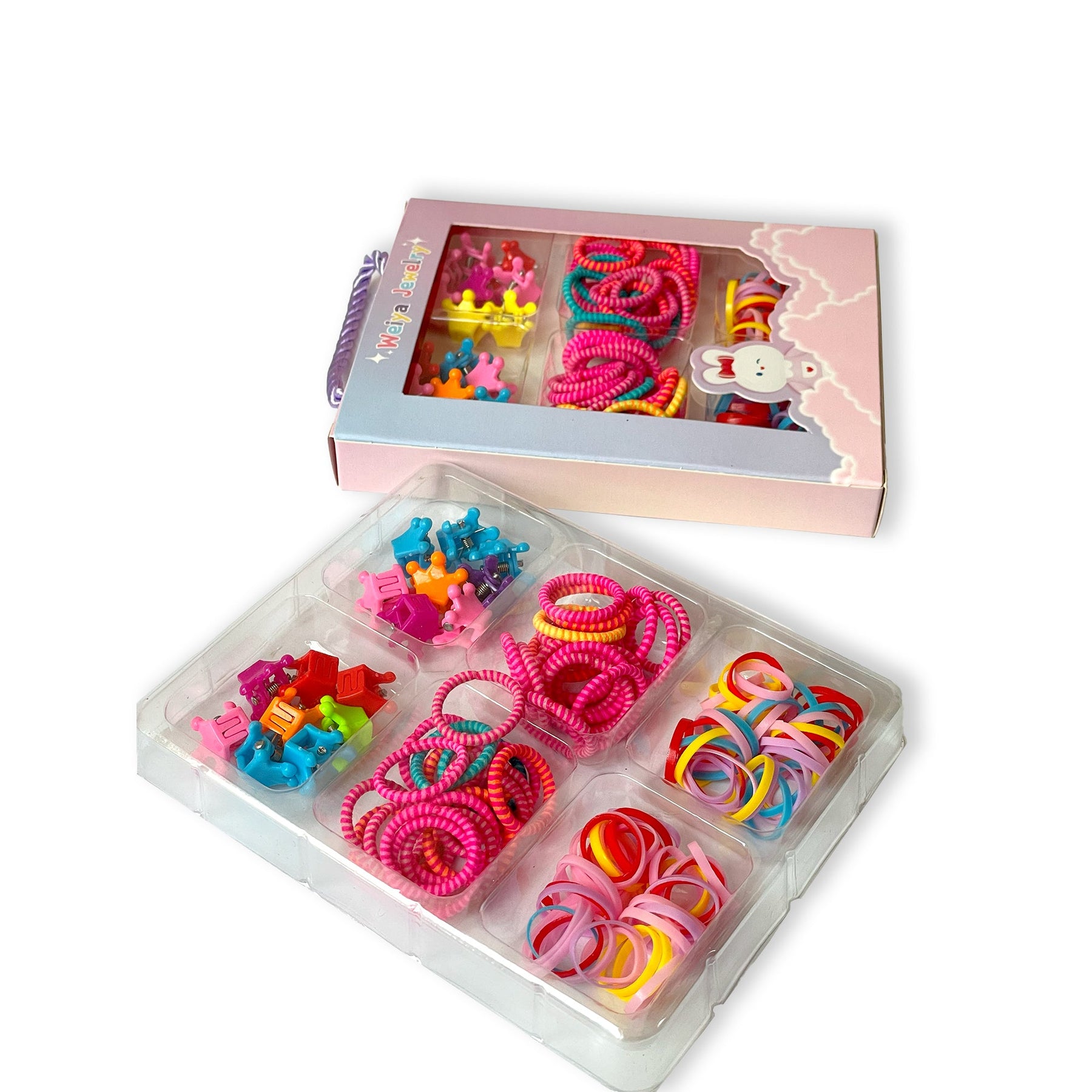 Organize and add a splash of color to your child's hair styling with this comprehensive hair accessory set, neatly packaged in a cute pastel box with a cloud motif! This kit includes a range of brightly colored hair ties, clips, and elastic bands. The various styles and sizes make it easy to create fun ponytails, braids, updos, and more. Presented in an appealing cloud-themed gift box, this set is ideal for keeping all their hair accessories neatly stored.