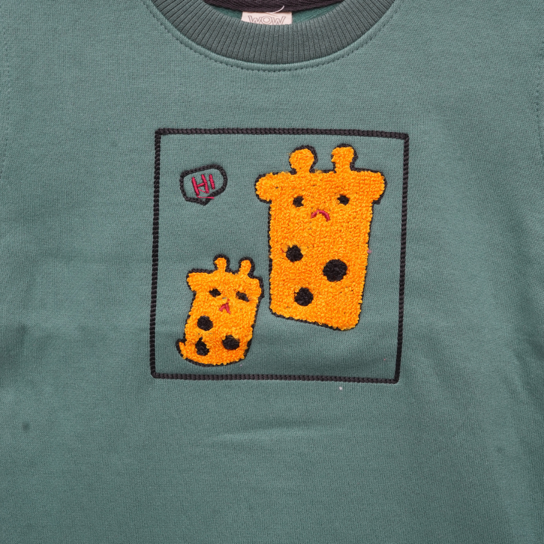 Green color, crewneck sweatshirt, fleece fabric, embroidery in front, ribbed cuffs and bottoms, soft fabric.