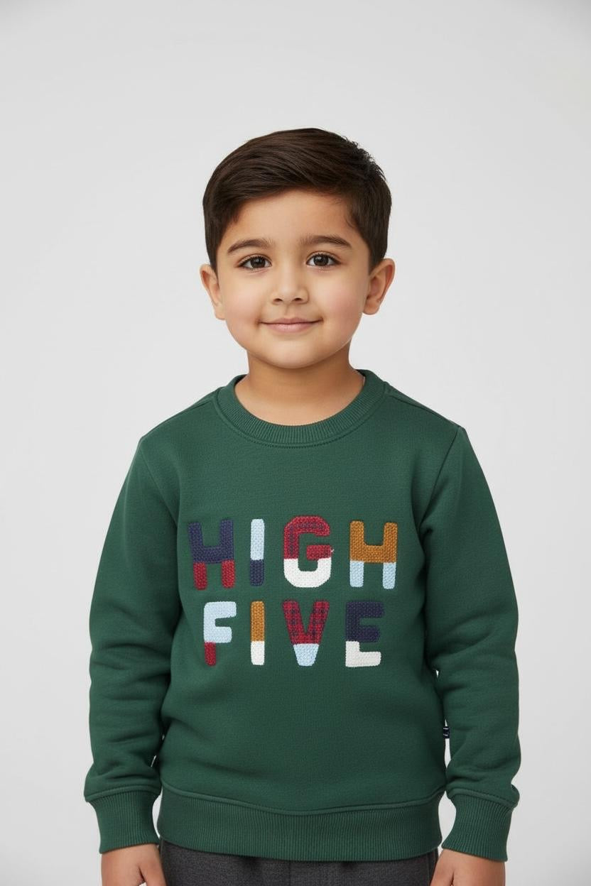 Green color, crewneck sweatshirt, fleece fabric, embroidery in front, ribbed cuffs and bottoms, soft fabric.