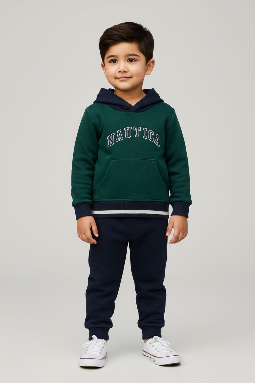 his sporty Nautica two-piece set is perfect for toddlers, offering comfort and a cool, color-blocked look. The set combines a cozy hooded sweatshirt with matching joggers in classic, complementary colors, making it an easy everyday outfit.