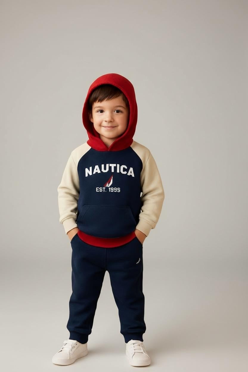 Nautical Graphic: The chest of the hoodie is branded with the Nautica name and "EST 1983" text above a classic sail/J-Class logo, printed in white.