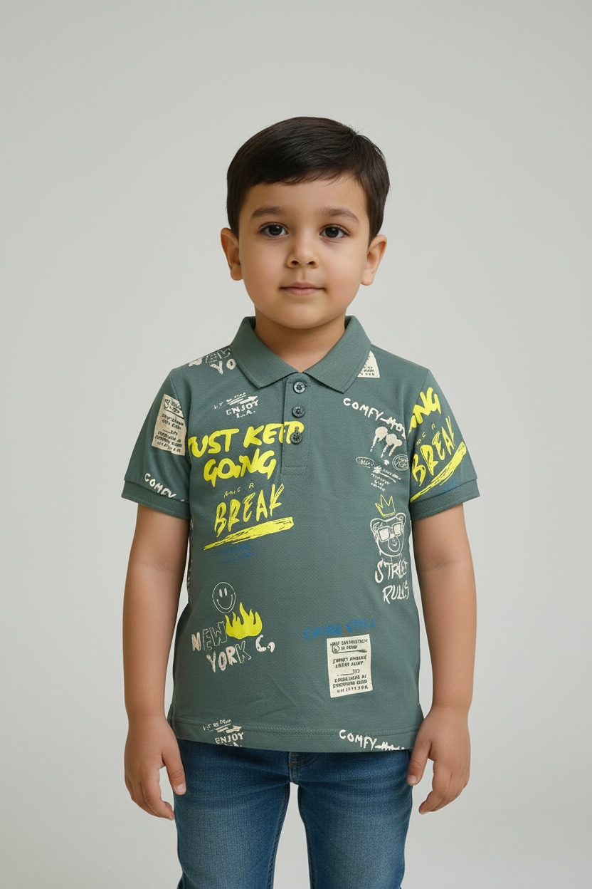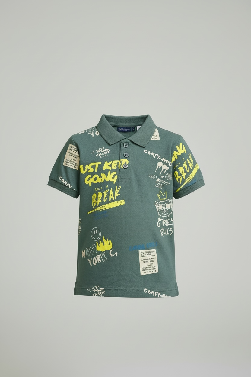 Fuel his adventurous spirit with this trendy sage green polo. Featuring a vibrant mix of lime yellow and cream graphics, this shirt is packed with urban details like the "Just Keep Going" slogan, "New York C." motifs, and fun street-inspired doodles. The classic three-button placket and structured collar offer a smart-casual look, while the breathable fabric ensures he stays comfortable all day. It’s the perfect statement piece for any young trendsetter.
