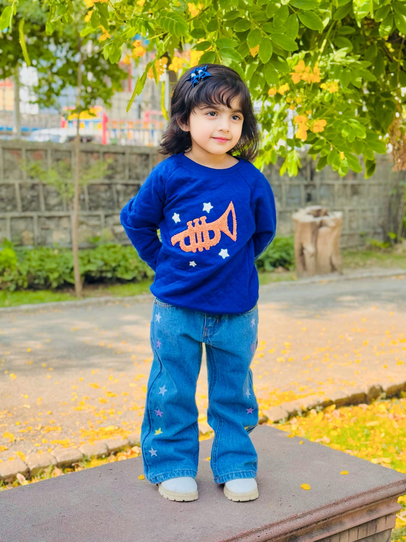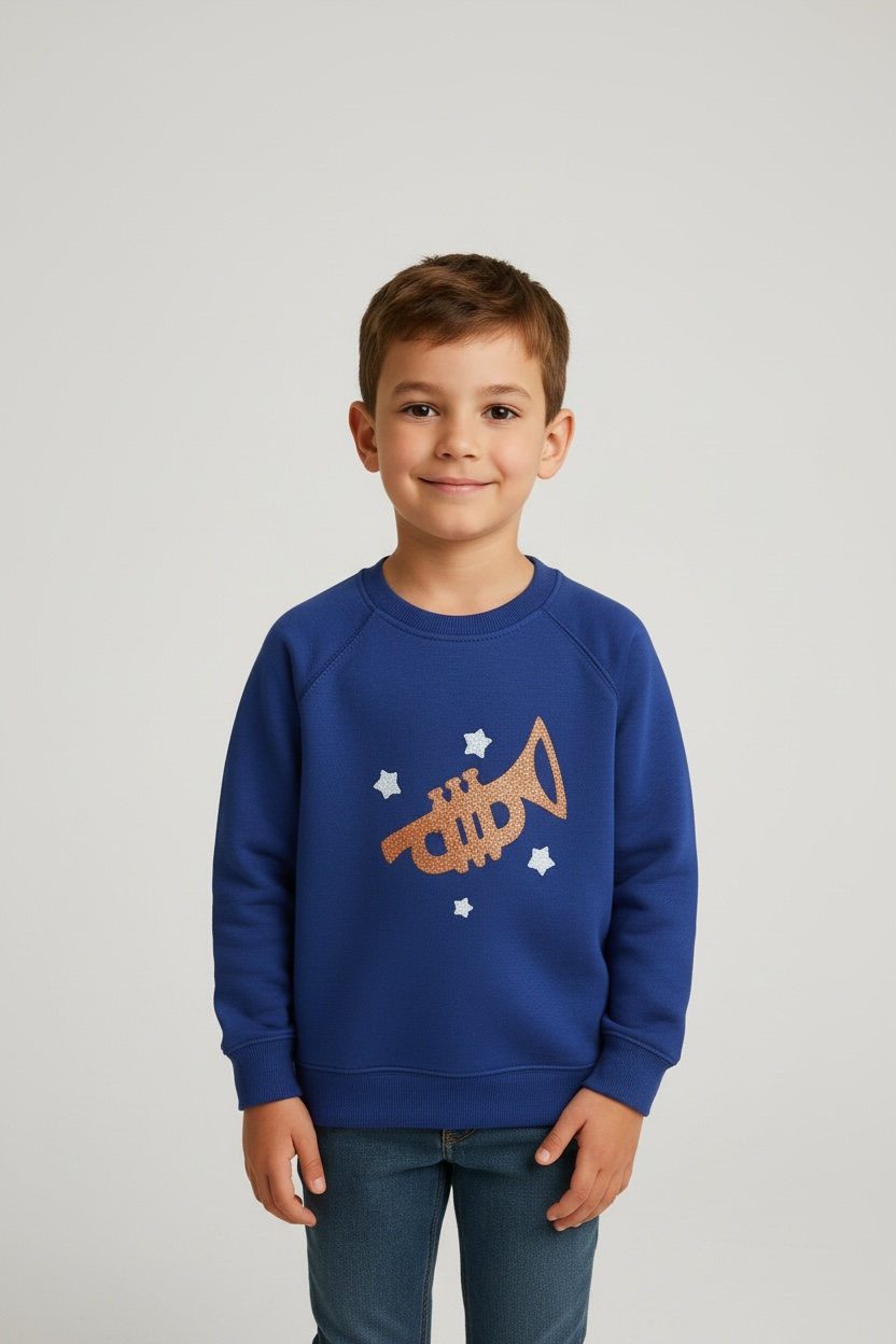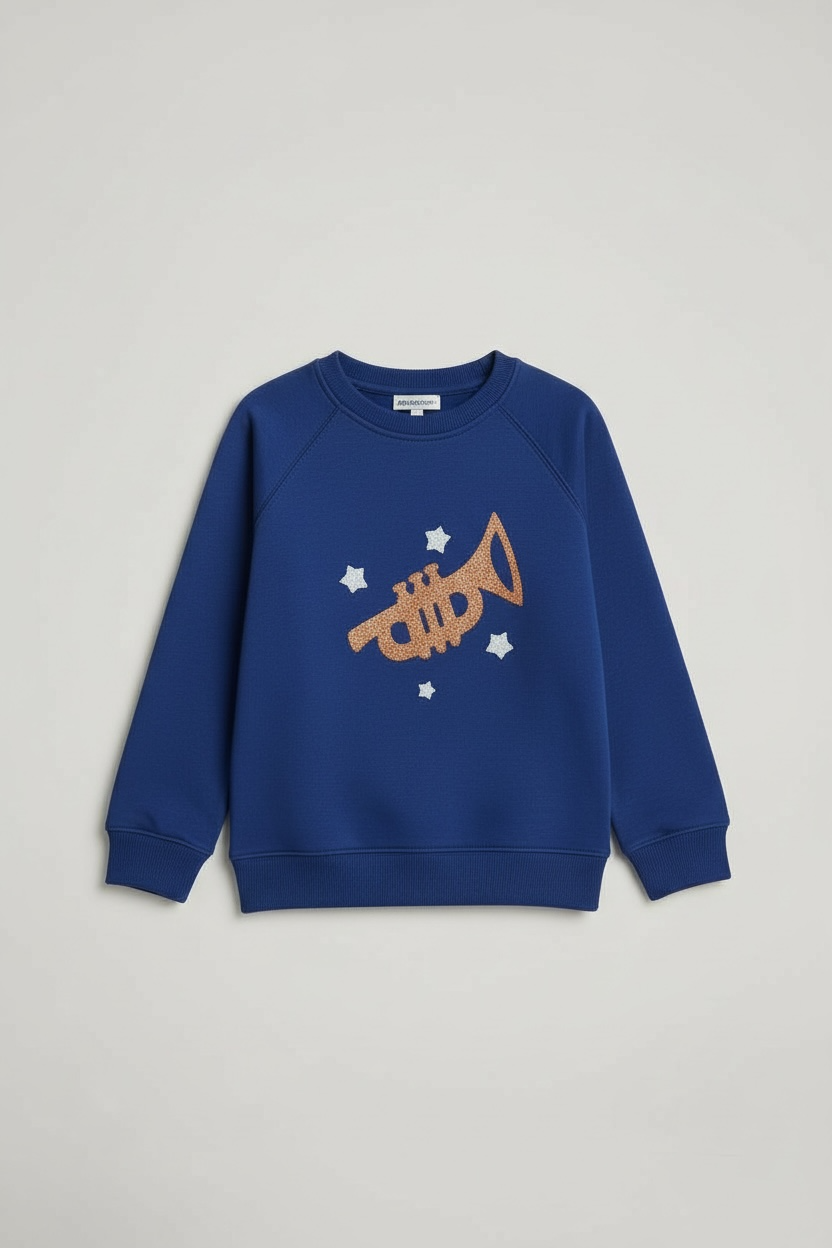 Blue color, quilted style, crewneck sweatshirt, fleece fabric, embroidery in front, ribbed cuffs and bottoms, soft fabric.