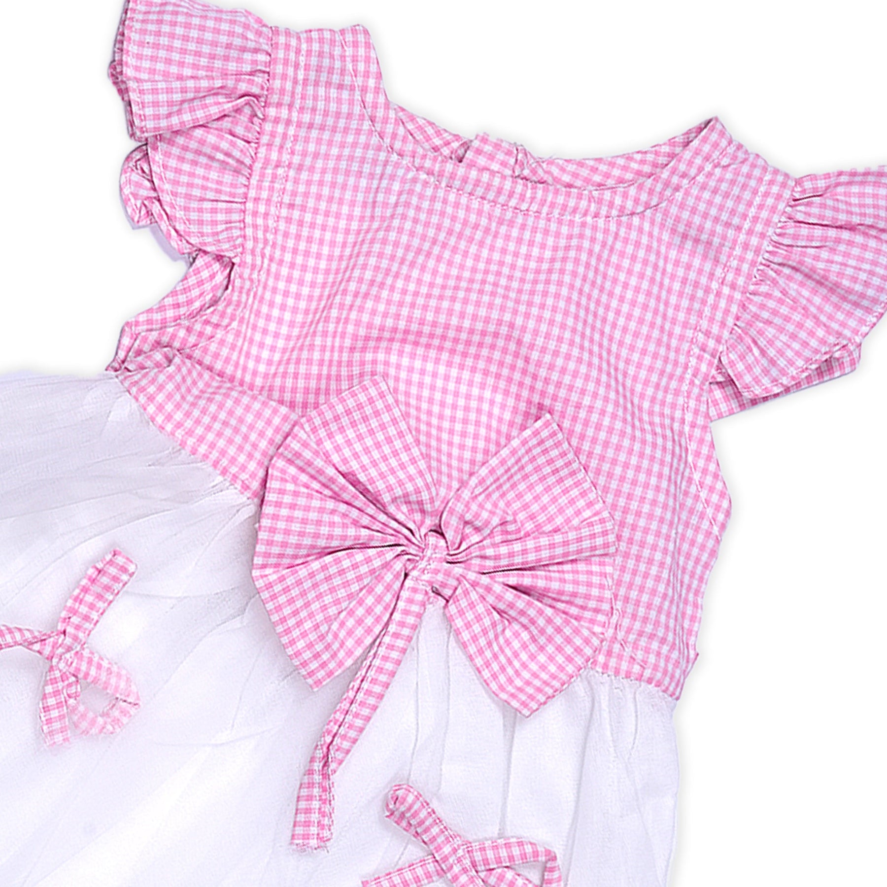 This charming baby girl's dress frock features a delightful pink and white gingham pattern, perfect for your little one's special occasions. The bodice showcases a classic gingham design with sweet, ruffled short sleeves. A large, matching gingham bow is centered on the dress, adding a touch of playful elegance. The white skirt portion is accented with two smaller gingham bows, creating a cohesive and adorable look. Made from soft, comfortable fabric, this dress is ideal for parties, photoshoots, or simply dressing your baby girl in style.