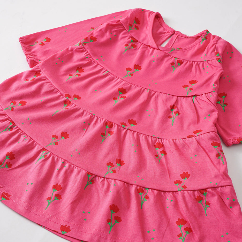 This charming dress features a vibrant pink color with a delicate floral print scattered throughout. The dress has long sleeves and a round neckline with a small keyhole opening at the top. It is designed with a tiered or layered effect, creating a slightly ruffled or gathered look. The flat lay presentation allows for a clear view of the entire dress and its design details. The pink color and floral print create a sweet and feminine look, making it a comfortable and stylish choice for a young girl. The location, Karachi, Sindh, Pakistan, is also noted. The image also indicates that this is a "Girls Frill Frock," suggesting a playful and feminine style. The brand name, "SLUB," is also included in the image.