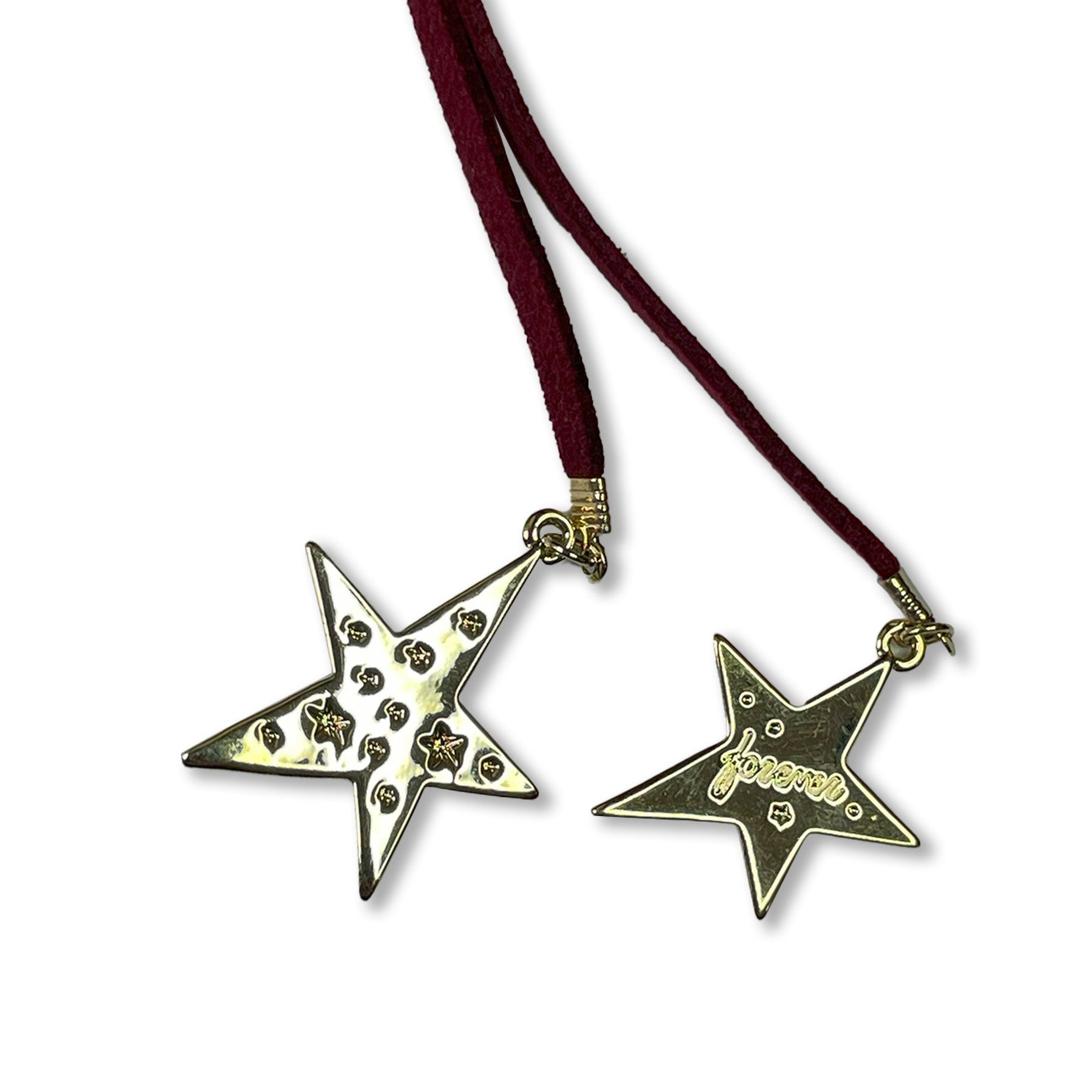 Unfurl a whisper of cosmic wonder with this unique tether necklace. Crafted from a luxuriously soft, deep-hued cord, it invites you to personalize your style with a simple, elegant tie. Instead of a traditional clasp, the cord becomes an integral part of the design, allowing for adjustable lengths and a subtly bohemian feel. At each end, twin starburst pendants, alight with a constellation of tiny, shimmering facets, dangle with captivating movement. This isn't just a necklace; it's a personal celestial connection, a delicate thread of starlight to wear close to your heart.