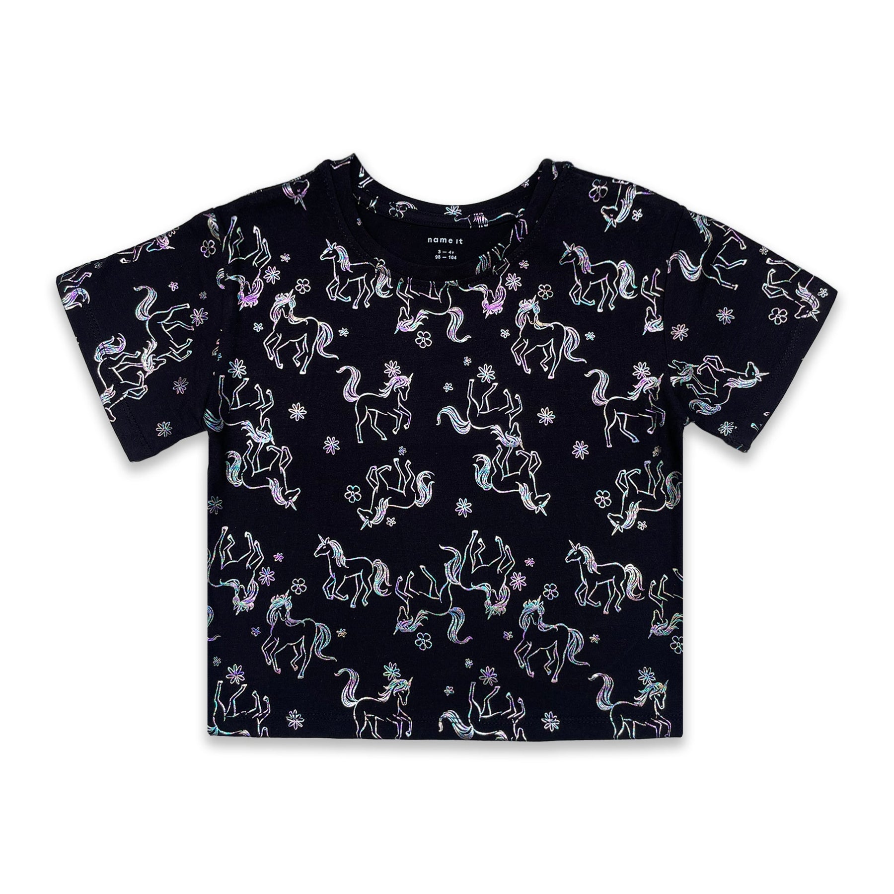 Gallop into magical style with this enchanting Girls' Black Iridescent Unicorn & Flower Print T-Shirt. This short-sleeved tee features a classic black background adorned with an all-over repeating pattern of majestic unicorns and delicate floral or snowflake-like designs. Both the unicorns and flowers are outlined in a captivating iridescent finish that shimmers with shades of pink, purple, green, and silver as the light catches them. With its comfortable round neck, this t-shirt is perfect for adding a whimsical and dazzling touch to her casual wardrobe.