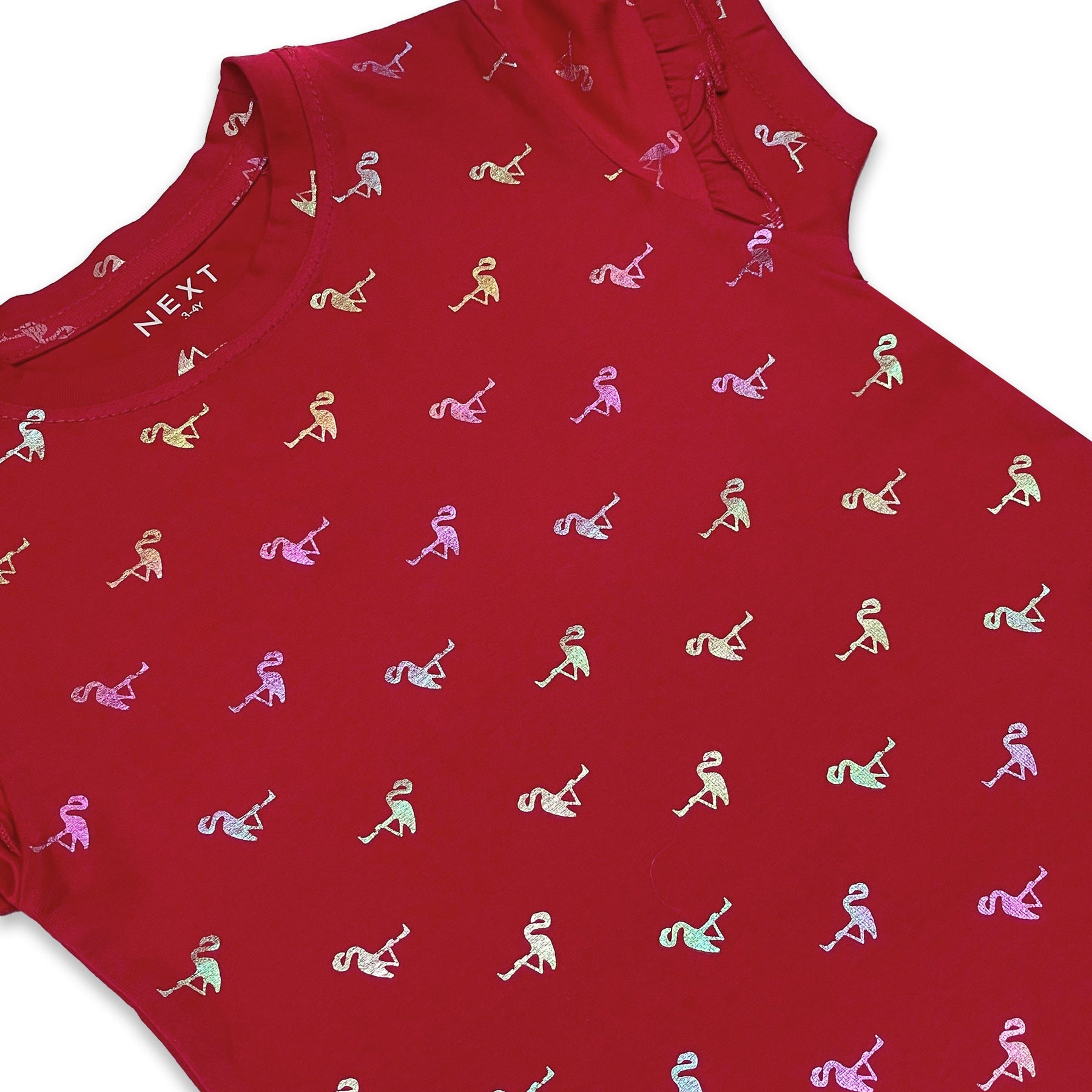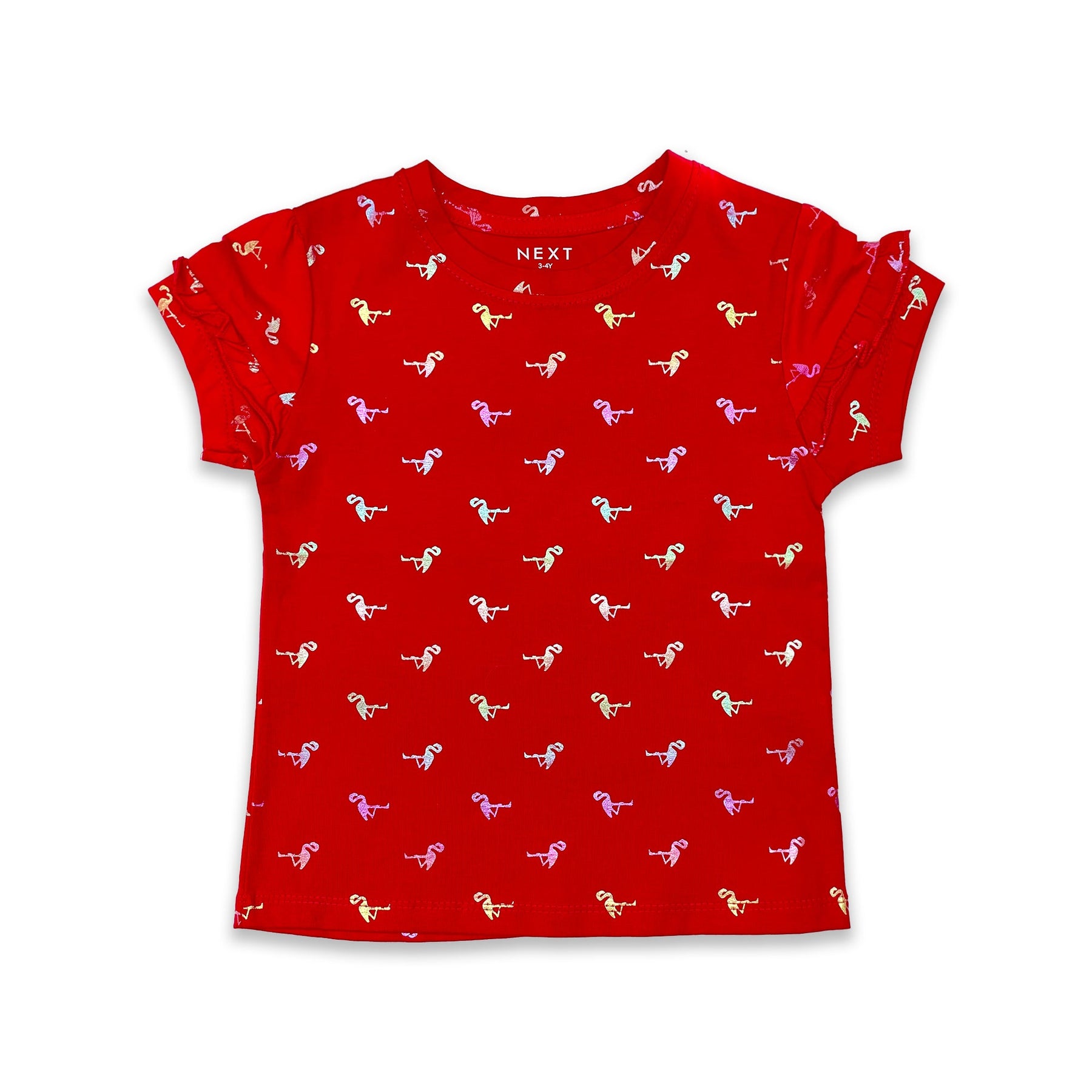 Roar into style with this vibrant Girls' Red Dinosaur Print T-Shirt! This short-sleeved tee features a lively red background adorned with an all-over repeating pattern of small, colorful dinosaur outlines in shades of yellow, pink, and blue. Adding a sweet detail are the charming ruffle accents on the sleeves. With its comfortable round neck, this t-shirt is perfect for any young dinosaur enthusiast, bringing a playful and bright touch to her casual wardrobe.