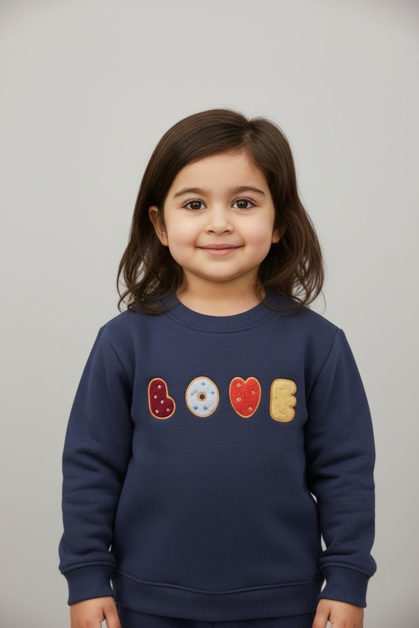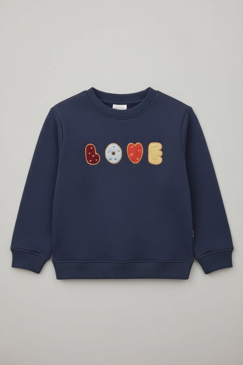 Dark blue color, crewneck sweatshirt, fleece fabric, embroidery in front, ribbed cuffs and bottoms, soft fabric.