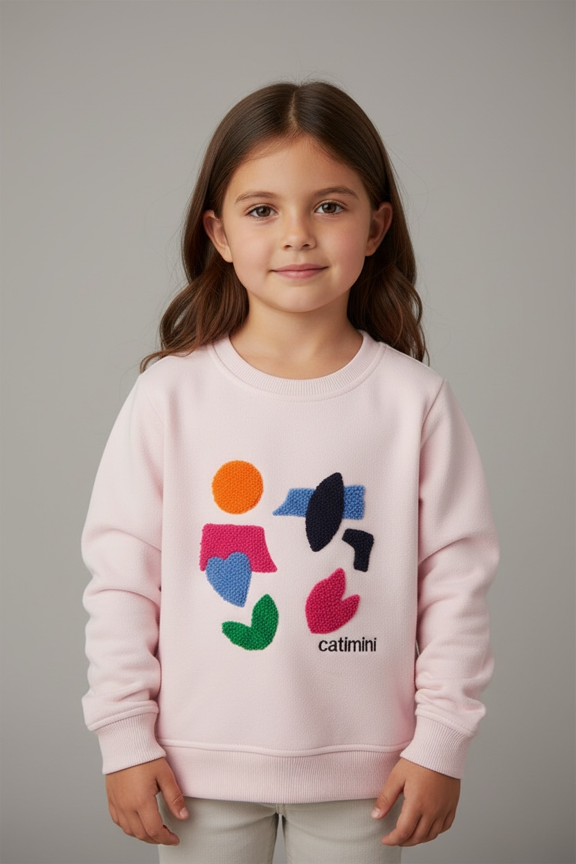 Light pink color, crewneck sweatshirt, fleece fabric, embroidery in front, ribbed cuffs and bottoms, soft fabric.