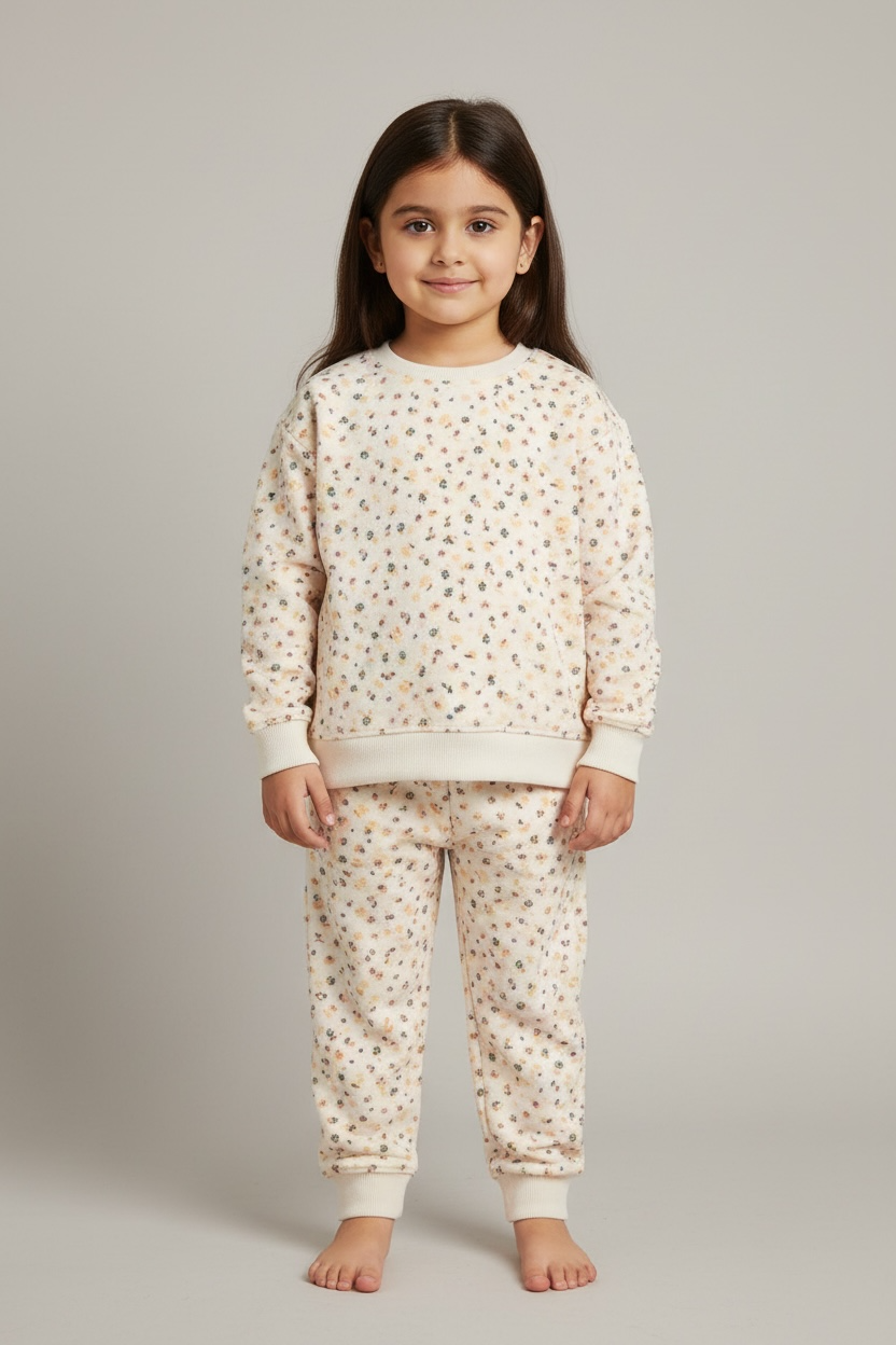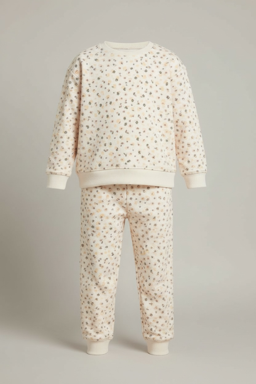 White color, two pieces: trousers and crewneck sweatshirt. Fleece fabric, printed in front, ribbed cuffs and bottoms, soft fabric.