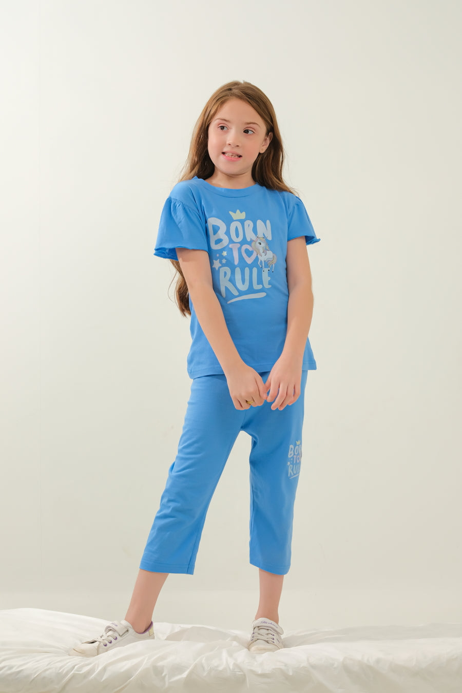 Let her reign in comfort and style with this vibrant Girls' Blue "Born To Rule" Lounge Set. This two-piece set features a bright blue short-sleeved top with cute ruffled sleeves and a bold graphic in white and darker blue text that proudly declares "Born To Rule." The matching blue cropped pants complete the look, offering head-to-toe comfort. Made for relaxed days and empowering moments, this versatile set is perfect for lounging at home, casual wear, or as inspiring sleepwear.