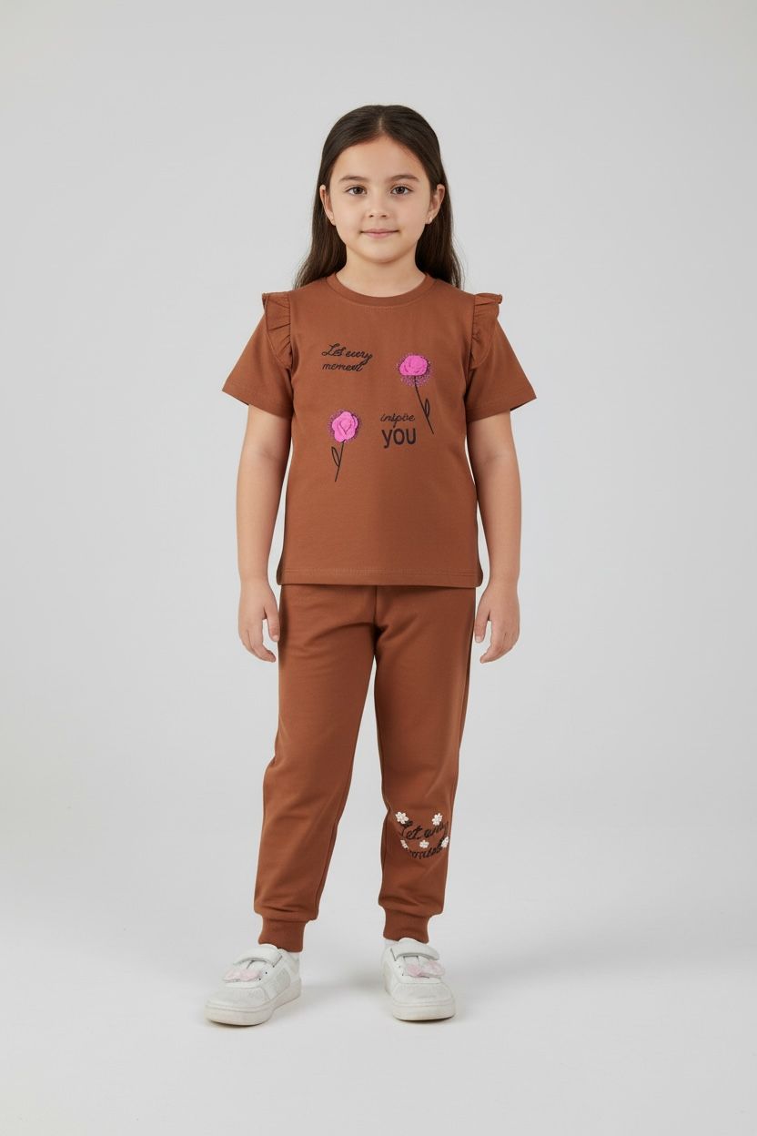 Inspire your little one's day with this charming Kjunction girls' brown 2-piece set. This set features a short-sleeve top and matching pants. The top showcases the phrase "Let every moment inspire you" with delicate floral appliqués. The pants repeat the "Let every moment" message with embroidered floral details. The brown color is versatile and perfect for everyday wear. The top features stylish cold-shoulder cutouts with ruffle detailing. Made from a soft and comfortable fabric, this set is ideal for playdates, lounging, or casual outings. Let your girl embrace positivity and style with this Kjunction inspirational 2-piece set