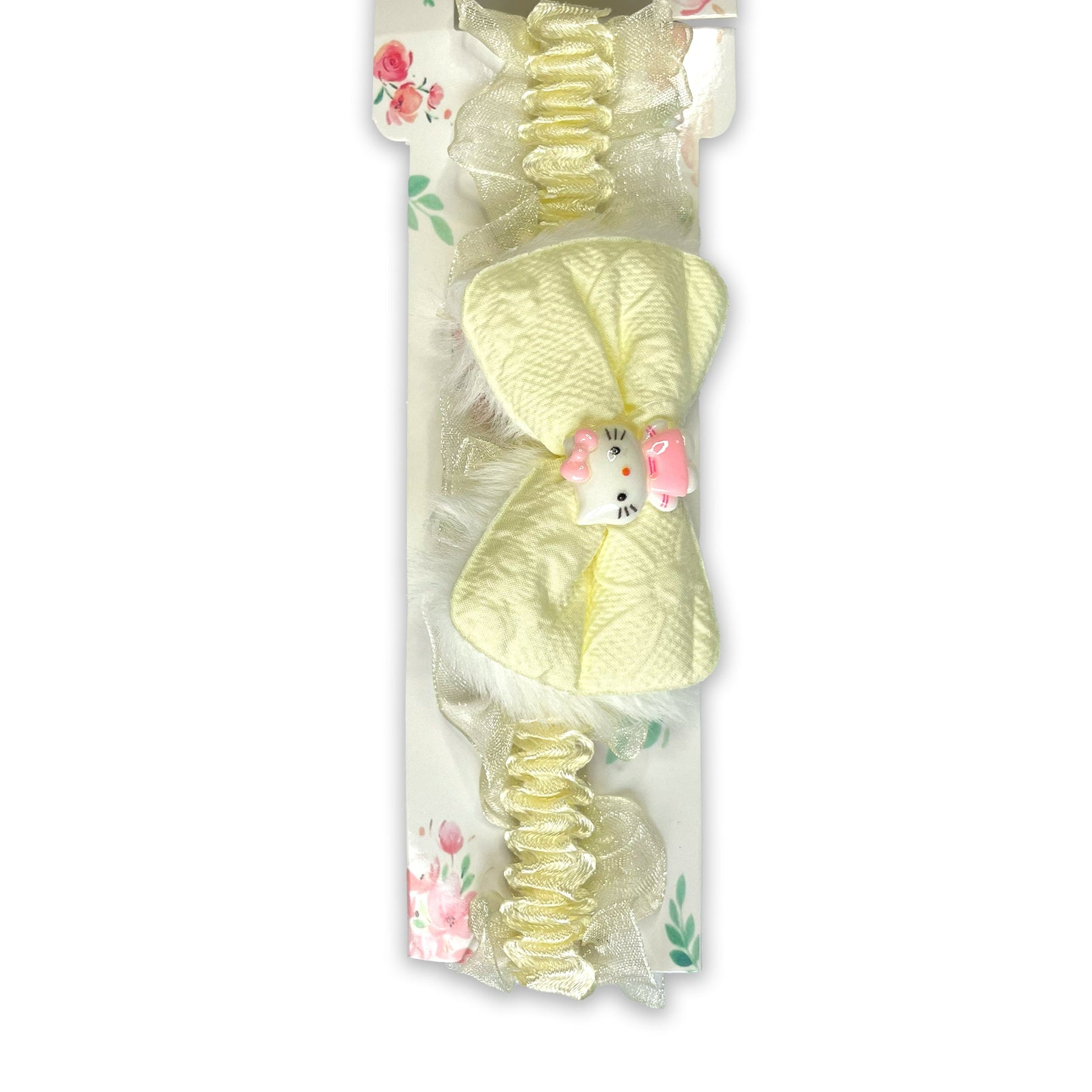 This adorable baby headband features a soft and stylish design in a lovely light Yellow color. It showcases a cute layered bow with a small white and pink animal embellishment in the center, complemented by delicate ruffles along the band. Made from a comfortable and stretchy material, this headband ensures a gentle fit for your baby's delicate head. Perfect for adding a sweet touch to any outfit, this headband is ideal for everyday wear or special occasions. It makes a wonderful accessory for your little one.