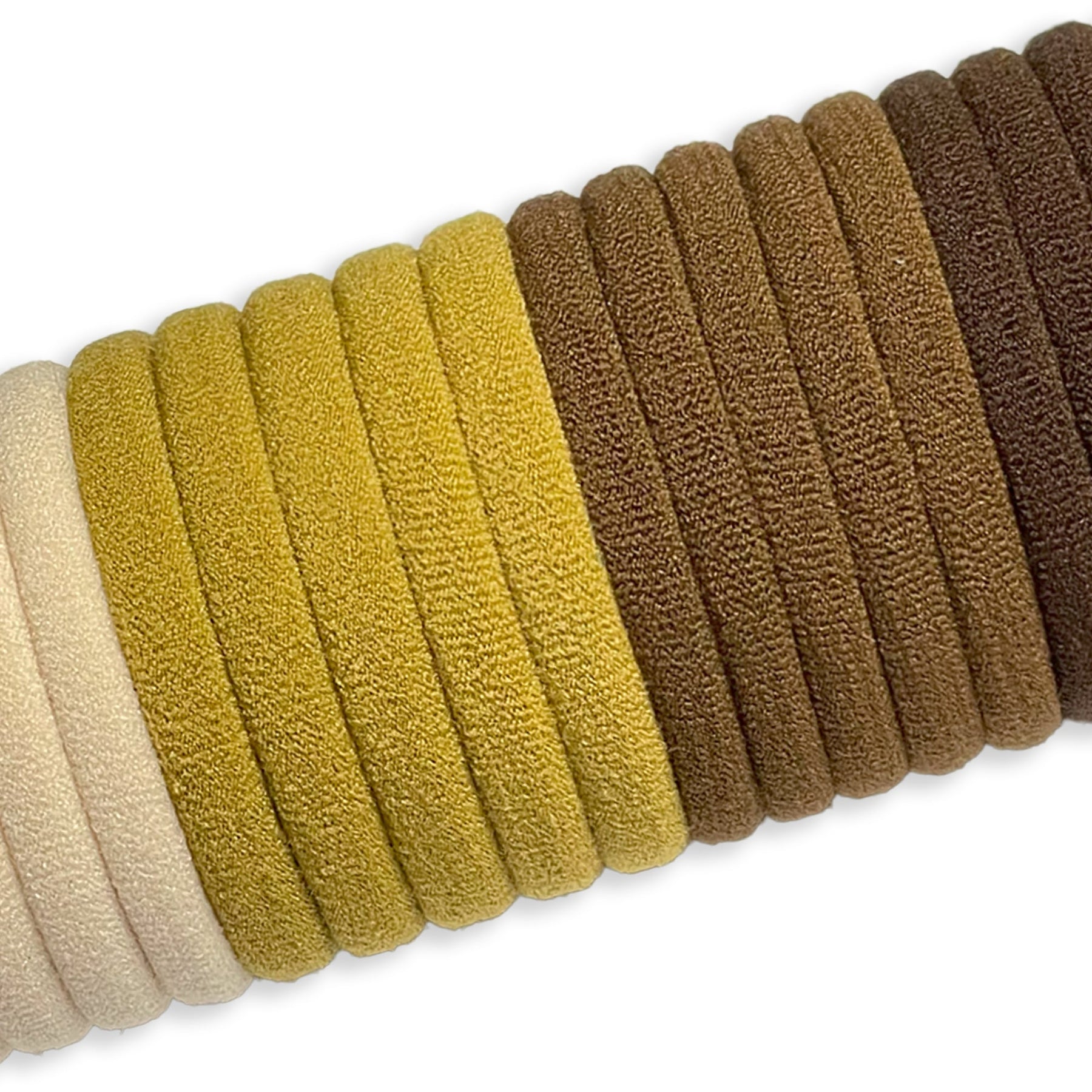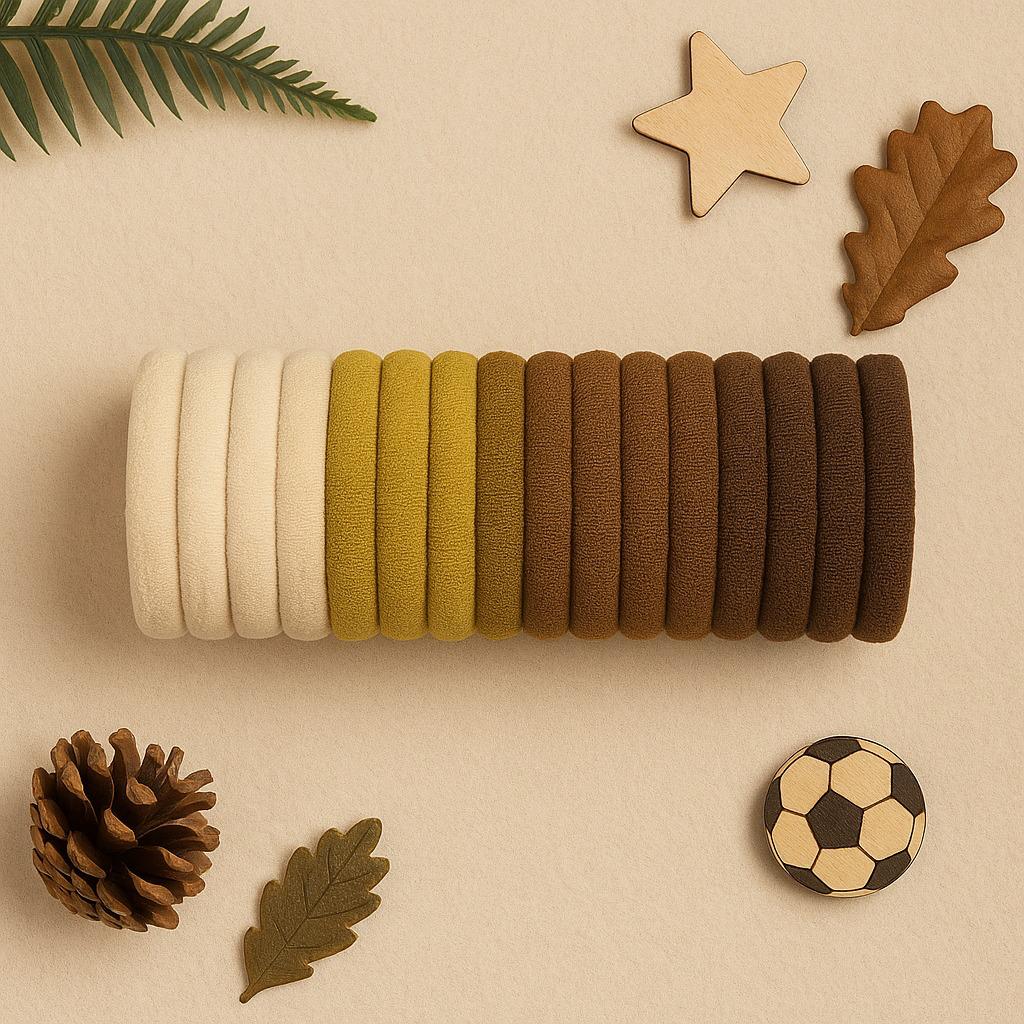 This set features a collection of soft and stretchy elastic hair ties in a range of versatile neutral tones. The set includes various shades of beige, tan, light brown, and dark brown. These seamless hair ties are designed to be gentle on hair, minimizing snags and breakage while providing a secure and comfortable hold for ponytails, braids, and other hairstyles. Perfect for blending in with various hair colors or adding a subtle, understated touch, this set is a practical and essential addition to any hair accessory collection