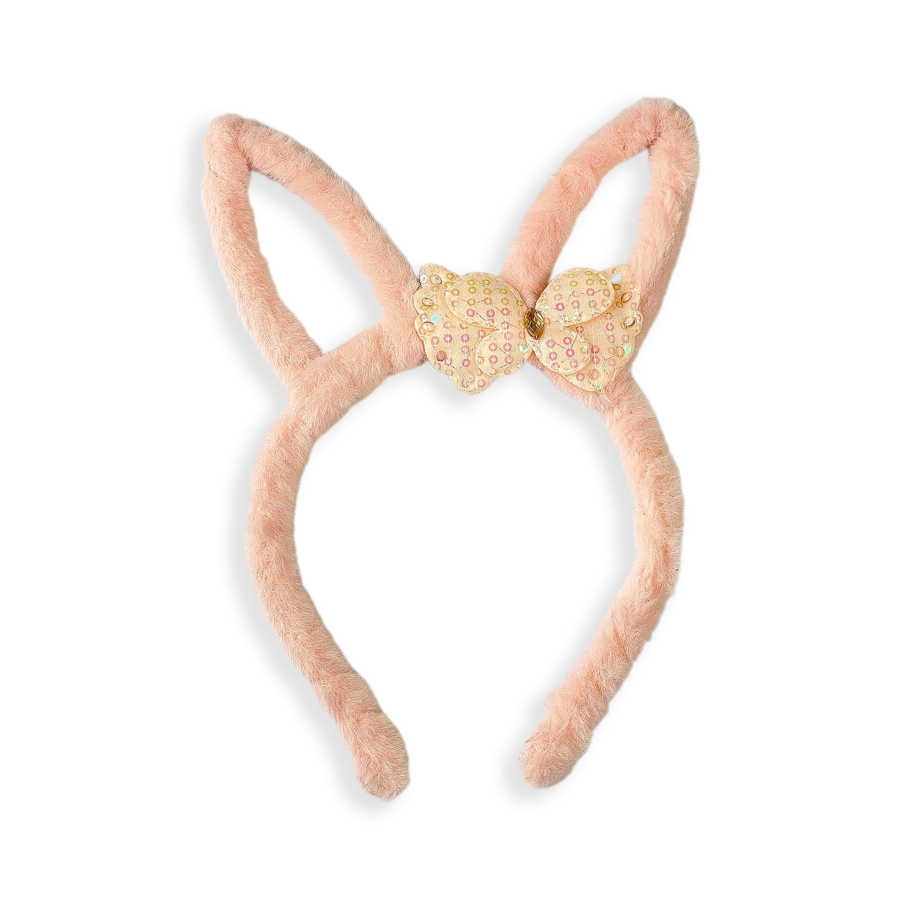 This adorable headband features soft, plush peach-colored bunny ears that stand upright. A charming bow is attached at the base of the ears, made from a light peach fabric with a delicate floral pattern in shades of peach and cream, accented with tiny gold dots. The headband itself is also covered in the same plush peach material for a comfortable fit. This playful accessory is perfect for adding a touch of whimsy and cuteness to any outfit, ideal for costume parties, themed events, or just for fun.