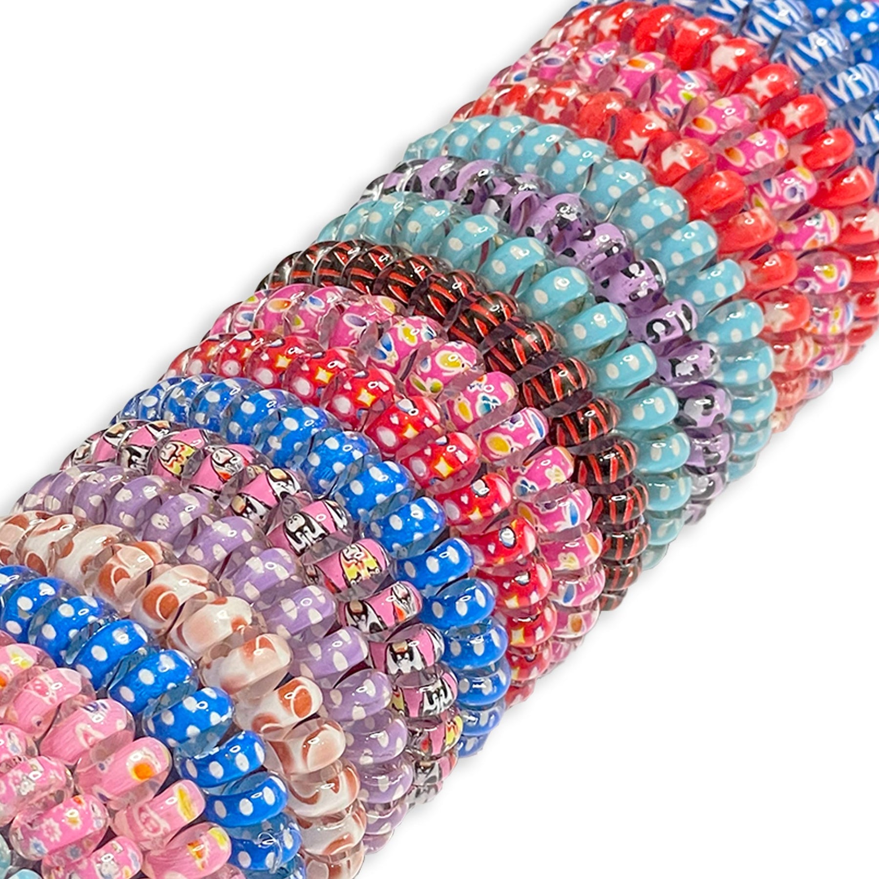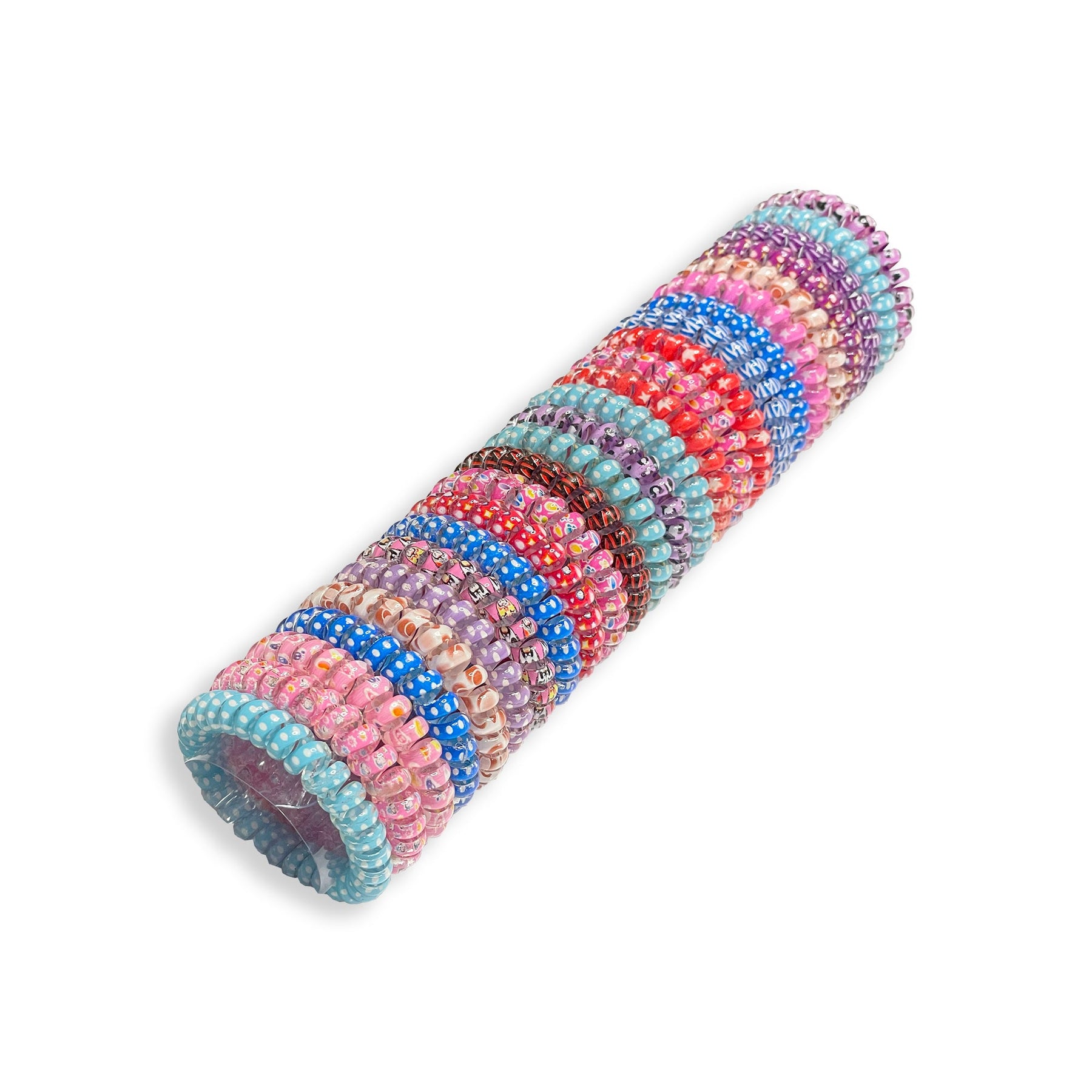 This set features a variety of colorful and patterned coil-style hair ties. Each hair tie is made from a smooth, flexible material formed into a spiral shape. The set includes a diverse range of designs, such as polka dots in various color combinations (white on blue, white on pink, etc.), floral prints, and other playful patterns in shades of pink, purple, blue, red, and more. These coil hair ties are designed to hold hair securely without creasing or pulling, making them a gentle and stylish alternative to traditional elastic bands. This set offers a fun assortment to match different outfits and moods.