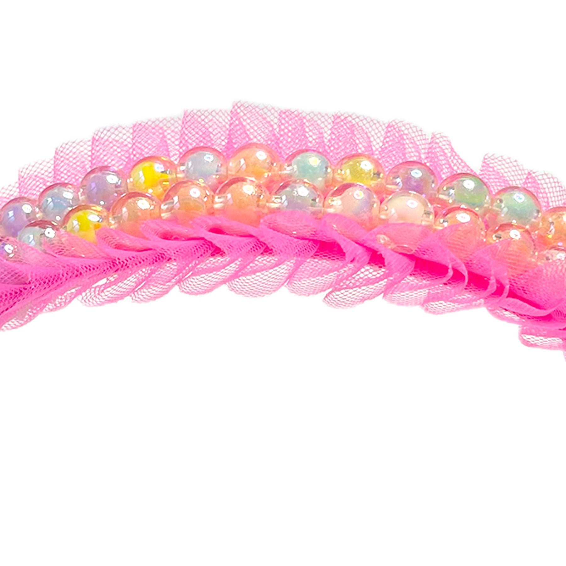 Indulge in a confection of sweetness with this delightful headband. A vibrant pink hue sets the stage for a whimsical design, featuring a soft tulle band adorned with iridescent faux pearls. The pearls shimmer with a kaleidoscope of pastel hues, adding a touch of playful sparkle. Delicate pink bows, nestled at each side, complete the charming aesthetic, evoking a sense of fairytale whimsy. Perfect for adding a touch of playful elegance to any hairstyle, this headband is sure to become a treasured accessory for both special occasions and everyday enchantment.