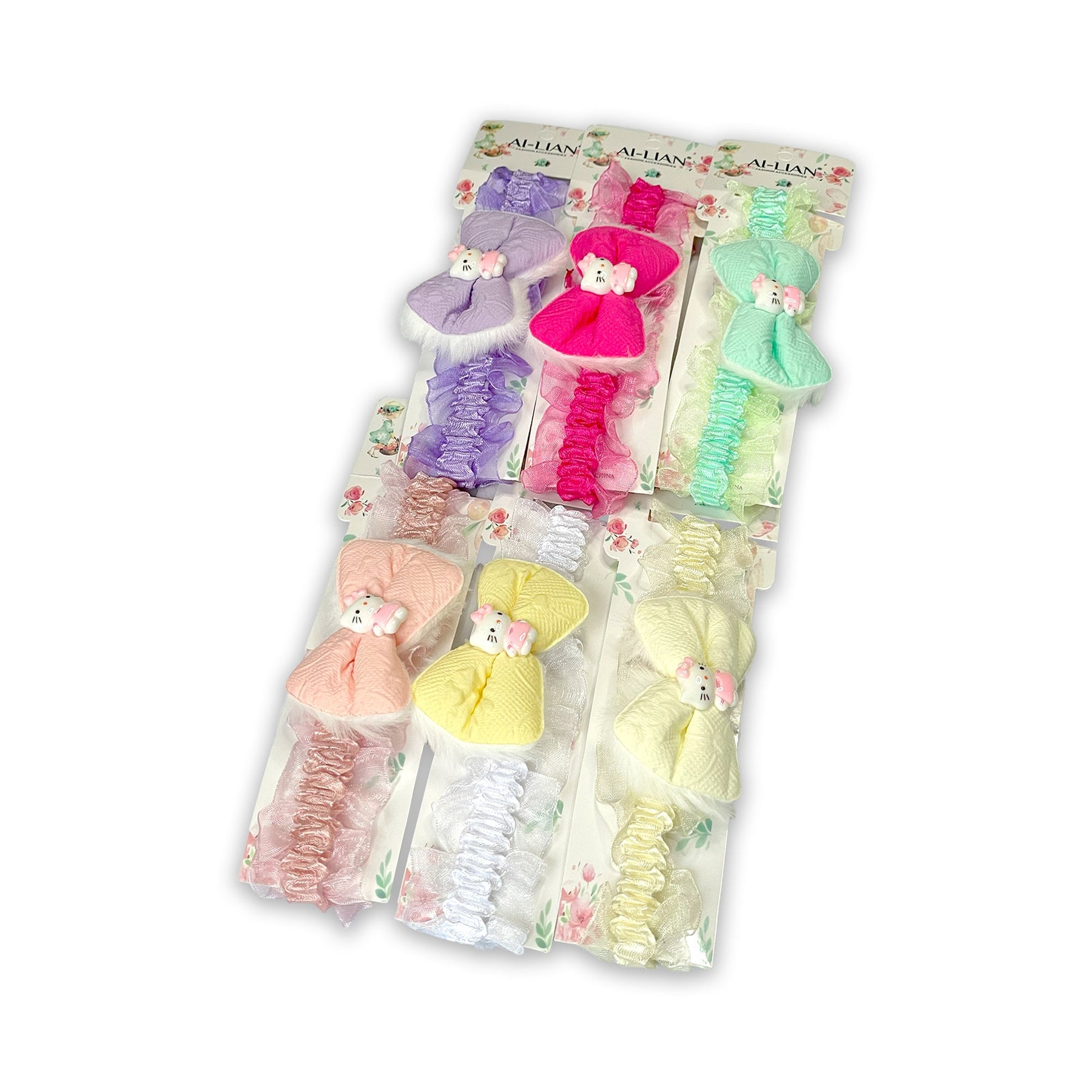 This adorable baby headband features a soft and stylish design in a lovely yellow color. It showcases a cute layered bow with a small white and pink animal embellishment in the center, complemented by delicate ruffles along the band. Made from a comfortable and stretchy material, this headband ensures a gentle fit for your baby's delicate head. Perfect for adding a sweet touch to any outfit, this headband is ideal for everyday wear or special occasions. It makes a wonderful accessory for your little one.