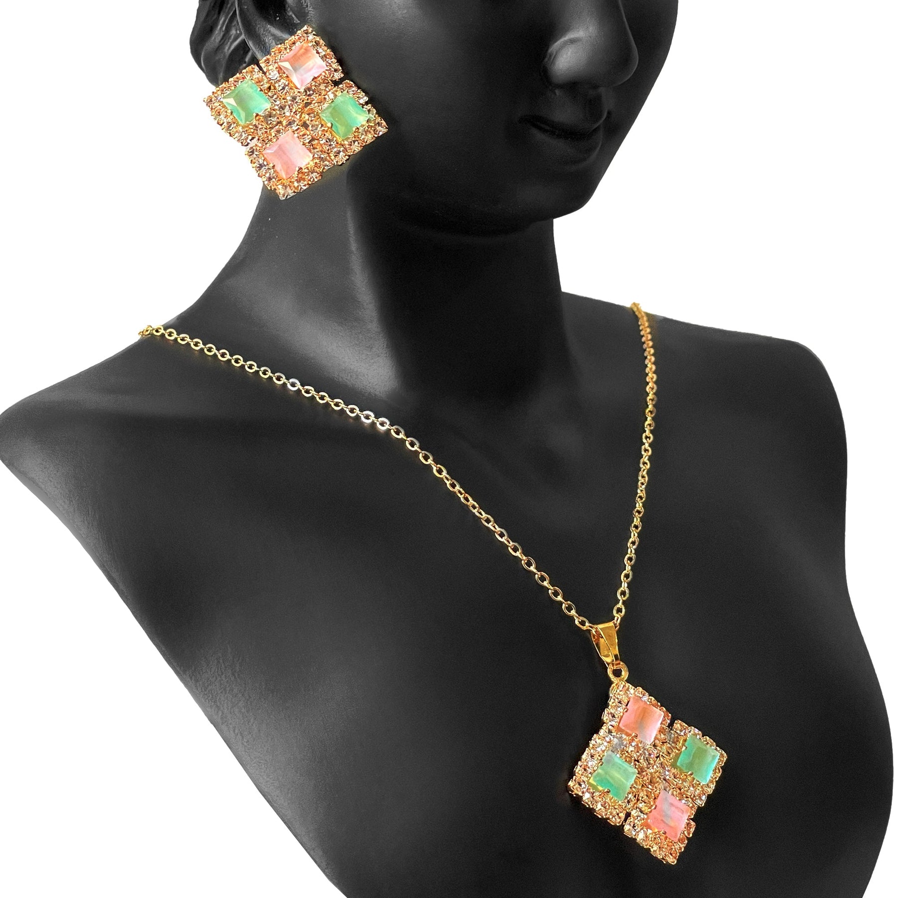 A charming and colorful necklace and earring set featuring a geometric, diamond-shaped design. The necklace pendant and matching stud earrings are each composed of four square-cut crystals in soft pastel shades of light green and pale peach, set within a sparkling frame of clear crystals and a gold-toned metal. The necklace hangs from a delicate gold-toned chain, creating a light and playful yet elegant look.