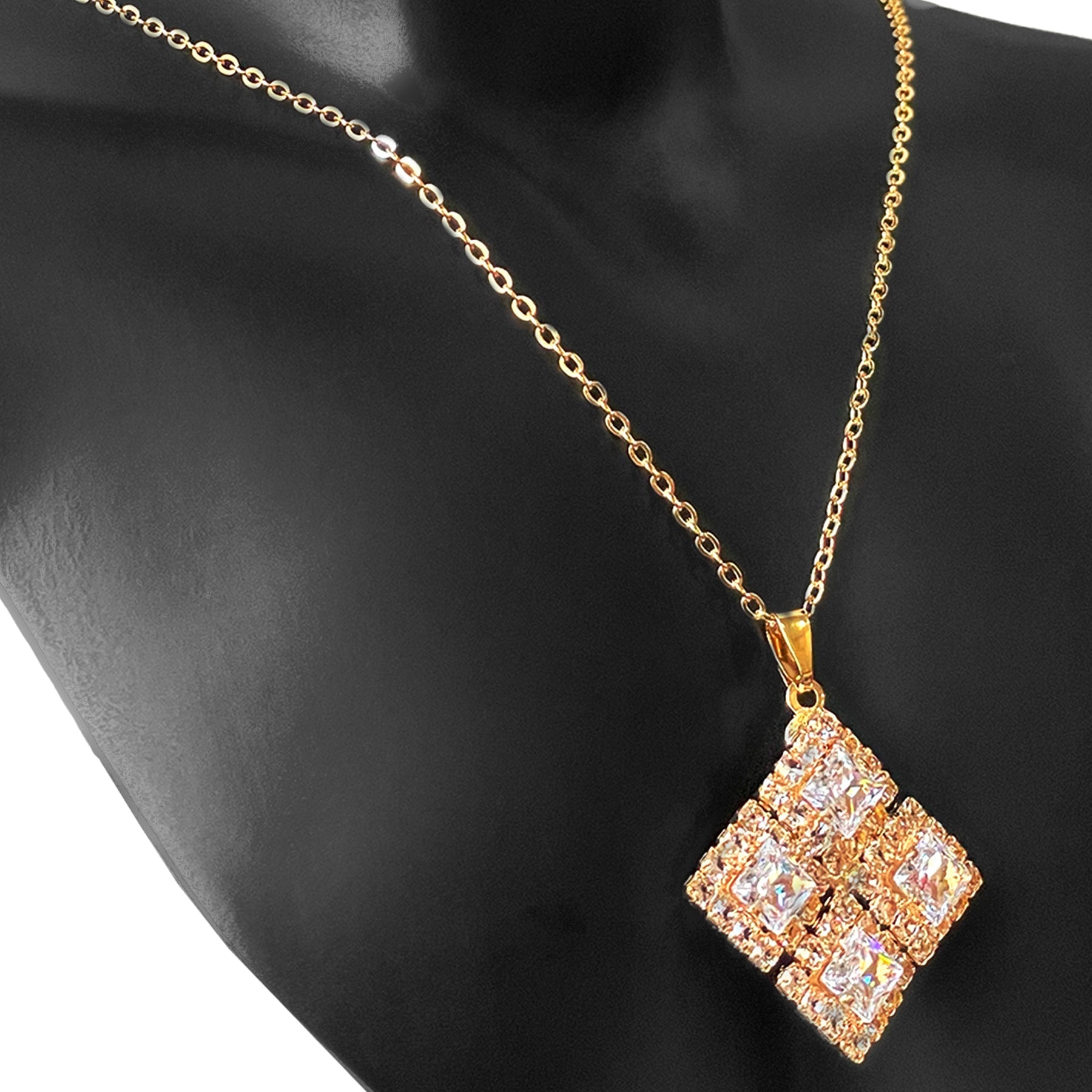 A dazzling and sophisticated necklace and earring set featuring a striking geometric diamond shape. The necklace pendant and matching stud earrings are entirely encrusted with sparkling clear crystals, beautifully set within a gold-toned metal frame. The numerous facets of the crystals catch and reflect light from every angle, creating a truly radiant effect. The necklace is suspended from a delicate gold-toned chain, making this set a perfect choice for adding a touch of glamour to any occasion.