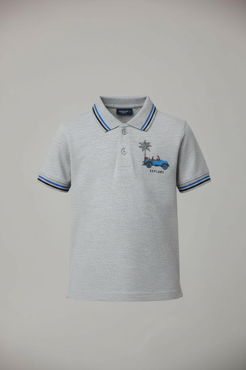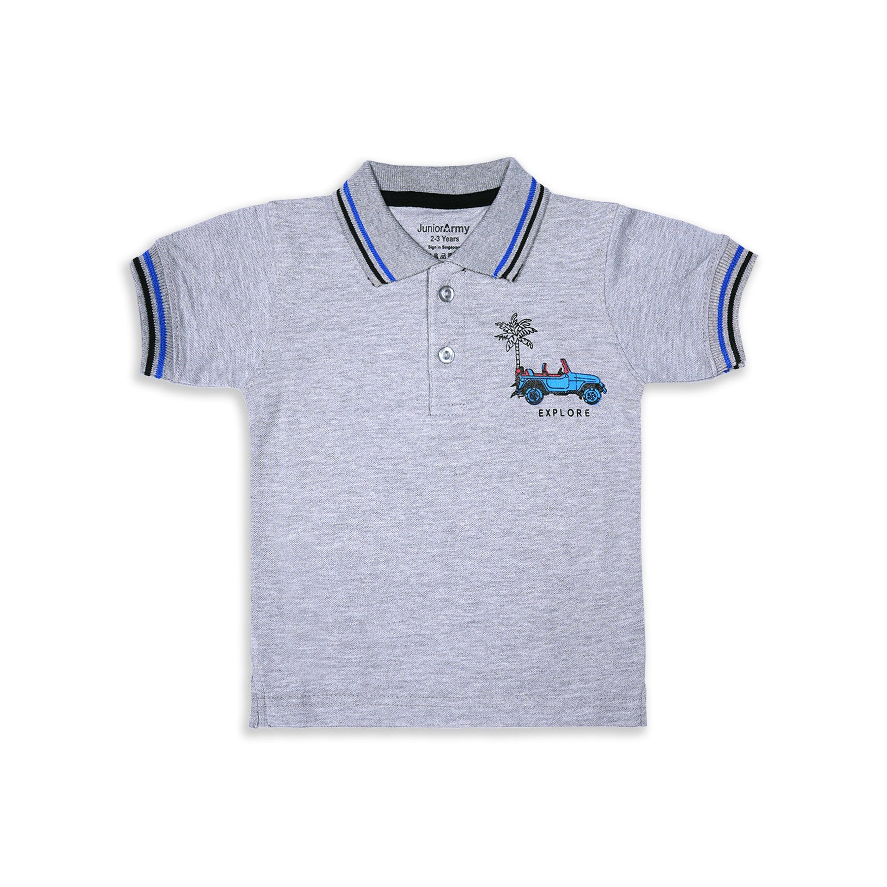 Bring a touch of sunny vibes to your little one's wardrobe with this JuniorArm boys' grey polo shirt. This comfortable and stylish polo features a fun graphic on the back showcasing a blue jeep, palm trees, and the phrase "LET THE SUNSHINE IN." Perfect for casual outings, playdates, or everyday wear, this shirt is crafted from a soft and breathable fabric to keep your child comfortable all day long. It features a classic polo collar with contrasting stripes in black, blue, and white, adding a sporty touch. Short sleeves with coordinating striped trim complete the look. This grey polo is a versatile addition to any young boy's wardrobe, perfect for adding a pop of color and a positive message to their style.