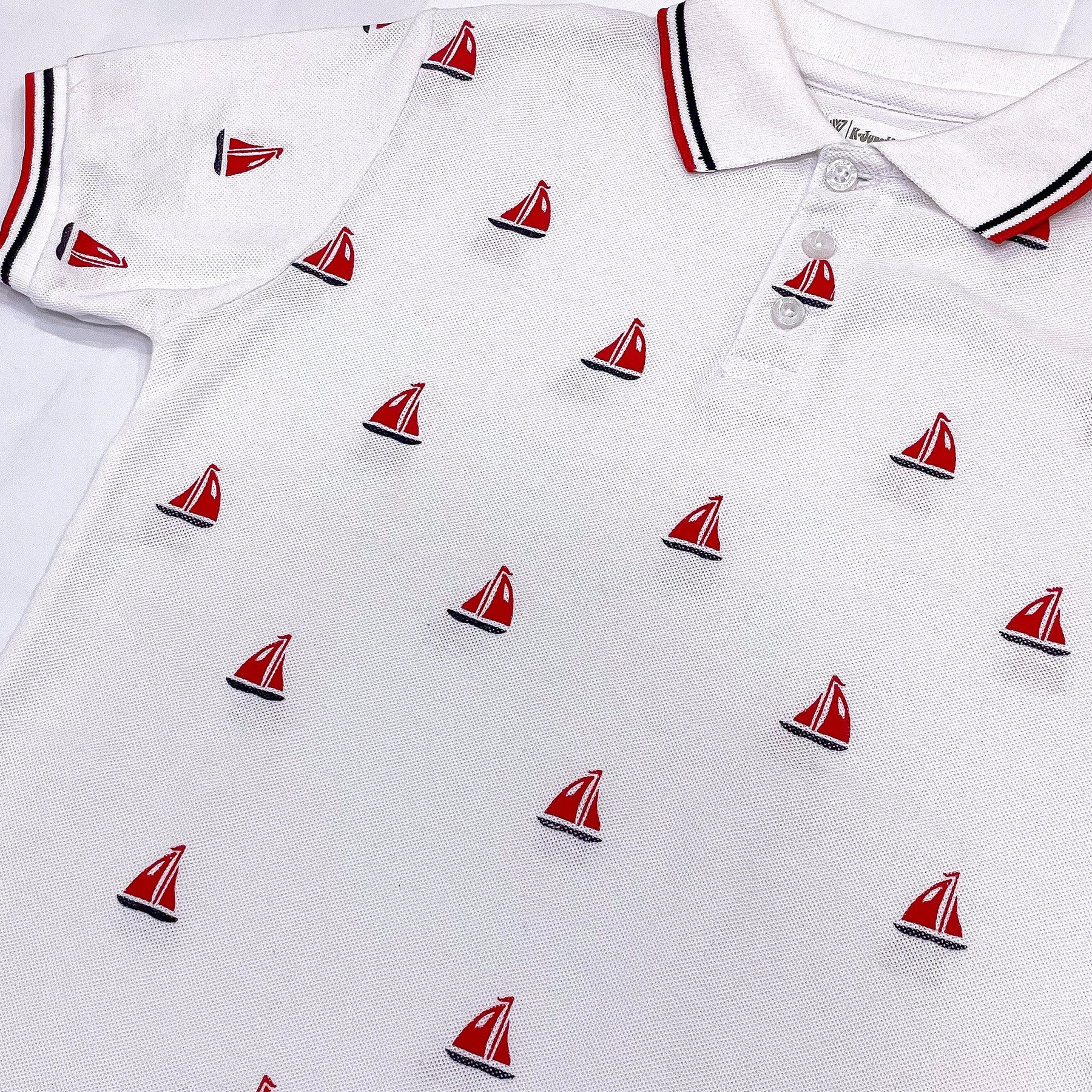Add a touch of nautical charm to your little one's wardrobe with this white polo shirt. Featuring an all-over sailboat print, this shirt is perfect for adding a playful touch to any outfit. The crisp white color is versatile and easy to pair with various bottoms. Made from a comfortable and breathable fabric, this polo shirt is ideal for everyday wear. It features a classic polo collar with a button-down placket and short sleeves. The collar and sleeves are finished with a striped trim, adding a touch of sporty detail. Let your boy sail away in style with this fun and fashionable polo shirt.