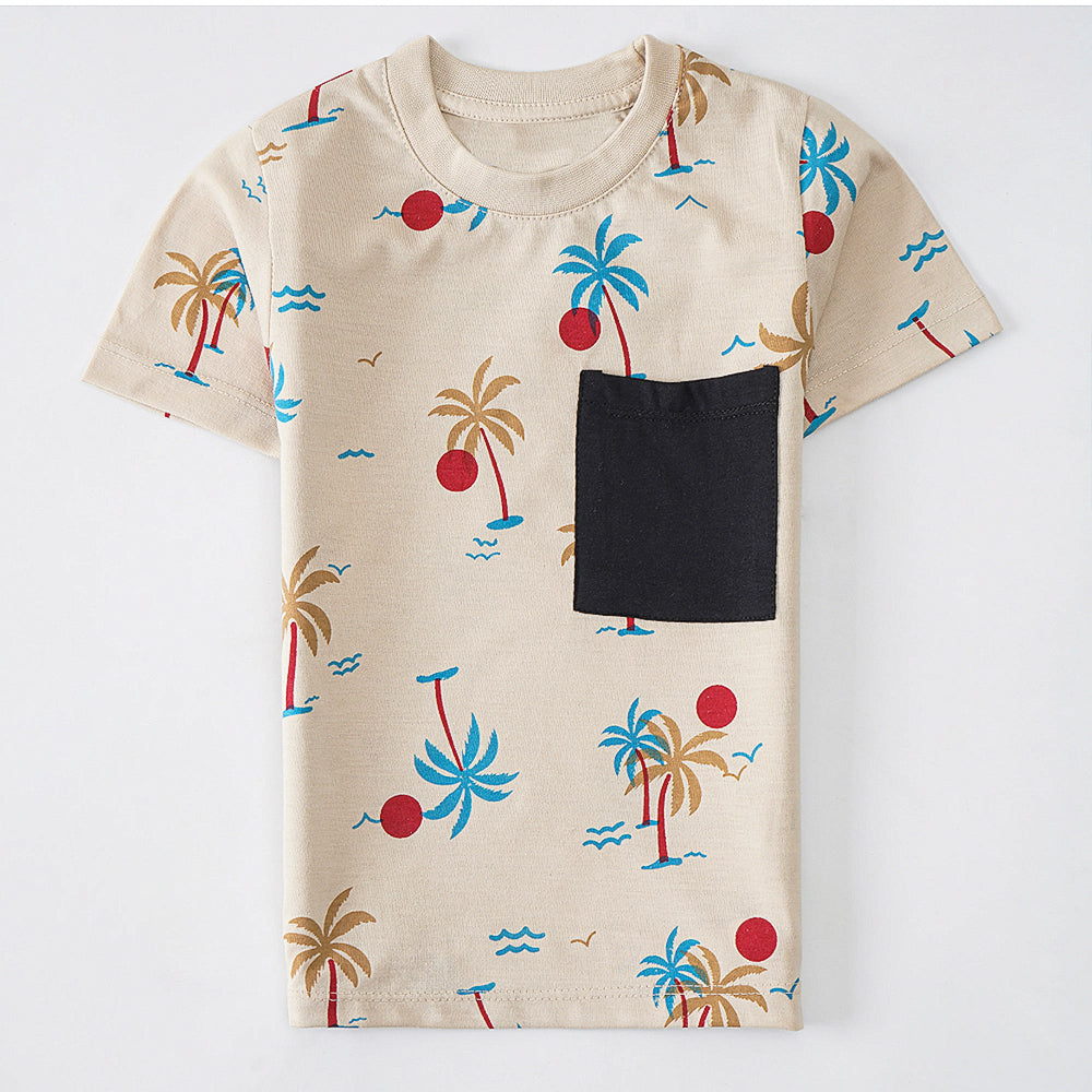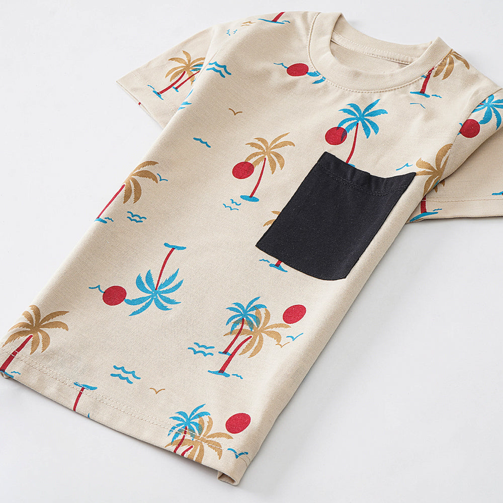 This beige t-shirt features a playful tropical print with palm trees, red circles (possibly suns or coconuts), and blue wave-like lines. The design is scattered across the entire shirt, creating a fun and summery look. The shirt also includes a contrasting dark square patch pocket on the chest, adding a unique detail. The t-shirt is made from a soft, comfortable material, ideal for everyday wear. The flat lay presentation allows for a clear view of the entire design and the pocket detail