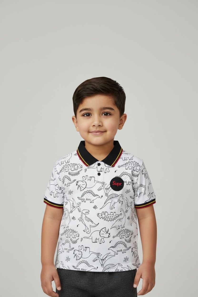 Unleash your little one's inner paleontologist with this Status Quo boys' white polo shirt. Proudly made in Karachi, Sindh, Pakistan, this polo features a cool and playful black outline dinosaur print all over, perfect for adding a touch of prehistoric fun to any outfit. The classic polo design is enhanced with a contrasting black collar and sleeve cuffs, accented with thin stripes in red and yellow, creating a sporty and stylish look. A round patch with "Status Quo" branding is featured on the chest. Made from a comfortable and breathable fabric, this shirt is ideal for everyday adventures, casual outings, or even dressier occasions. Let your child embark on a dino-mite adventure with this Status Quo dinosaur print polo, crafted with care in Karachi.