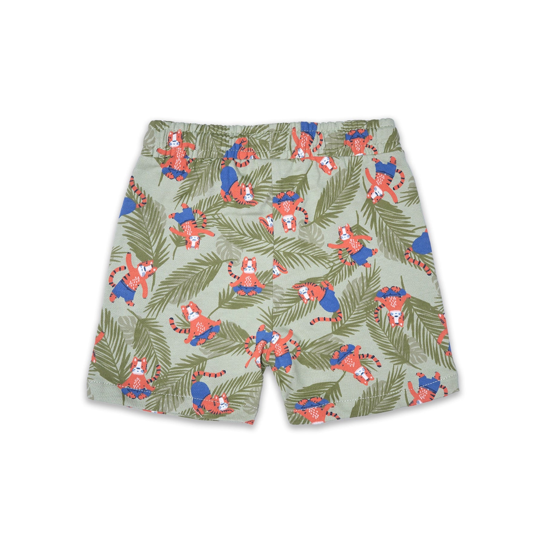 Bring a wild and playful touch to your little one's summer wardrobe with these JuniorArm boys' green shorts. Featuring a fun all-over print of tigers and palm leaves, these shorts are perfect for adventurous days. The light green background provides a cool and refreshing look. Made from a lightweight and breathable fabric, these shorts are ideal for warm weather. They feature an elastic waistband with a contrasting blue drawstring for a comfortable and adjustable fit. Practical pockets provide space for little treasures. Let your child roam free in comfort and style with these JuniorArm tiger and palm print shorts.
