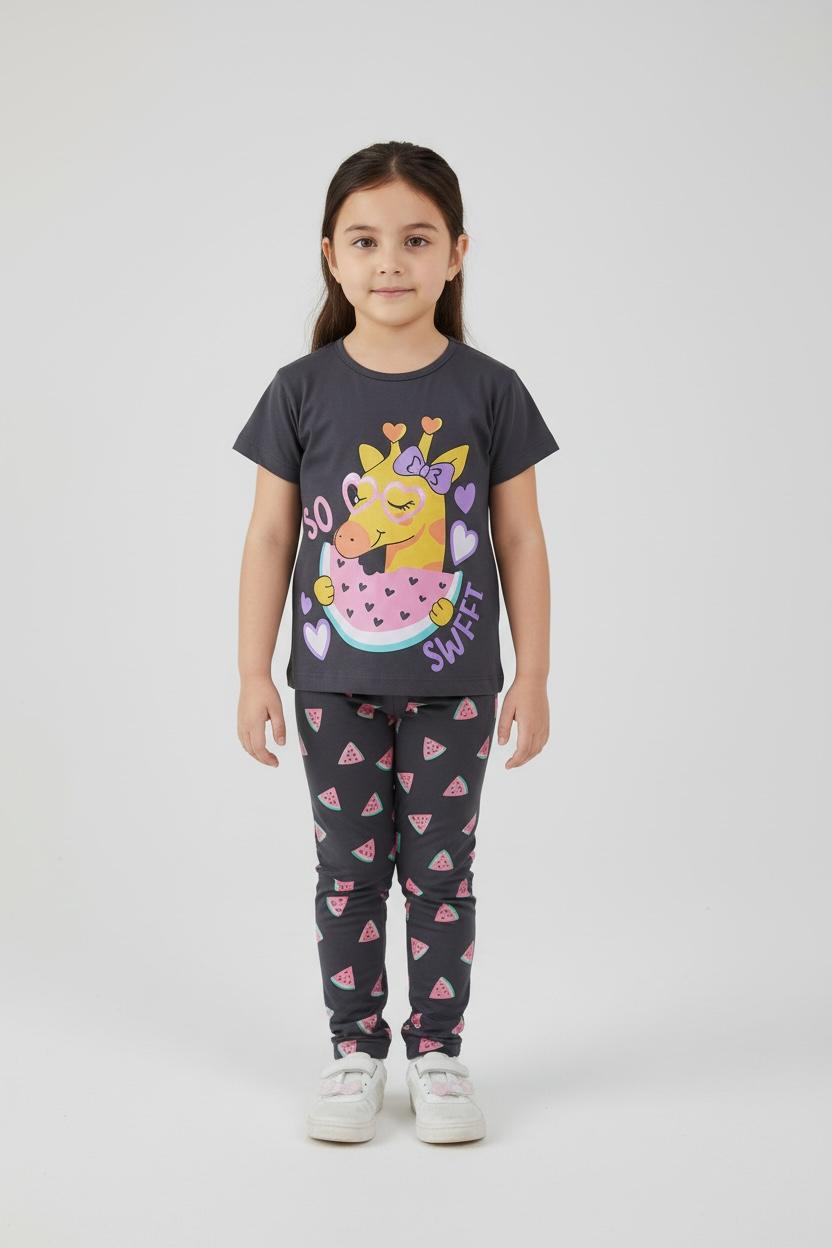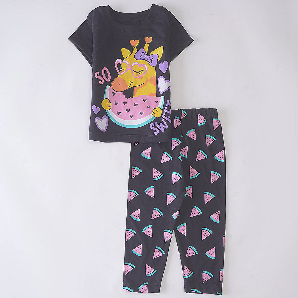 This adorable pajama set features a dark gray short-sleeved top and matching pants, both showcasing a playful giraffe and watermelon design. The top features a cute giraffe wearing glasses and a bow, nestled inside a watermelon slice, with the text "SO SWEET". The pants coordinate perfectly with a repeating watermelon slice pattern. The set is made from a soft, comfortable material, ideal for lounging and bedtime. The flat lay presentation allows for a clear view of the complete outfit and its charming design, highlighting the whimsical giraffe and watermelon theme.